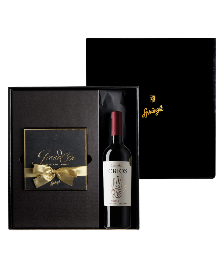Dark Sprüngli Grand Cru truffles made from the finest cocoa beans from the world's best origins and Malbec Crios from Susana Balbo in Mendoza. The fruity components and roasted aromas of the wine harmonize perfectly with the delicate dark chocolate notes of the Grand Cru truffles. 1 Sprüngli Grand Cru truffles, 16 pieces (shelf life 21 days) 1 Malbec Crios, Susana Balbo Wines, Mendoza, Argentina, 75 cl 1 gift box This item is available immediately at the main train station branch. At all other branches, it will be available within two business days after a telephone reservation. The truffles have a shelf life of 21 days. Truffle ingredients: Cocoa mass, sugar, cream, cocoa butter, butter, raw cane sugar, invert sugar, glucose, cocoa powder, emulsifier (soy lecithin), Bourbon vanilla. May contain hazelnuts and almonds. Nutritional information per 100g: Energy kJ: 2161.3 / kcal: 516.1, Fat: 39g, of which saturates: 25.5g, Carbohydrate: 32.2g, of which sugars: 28.4g, Fiber: 5.6g, Protein: 4.7g, Salt: 0g. Milk fat: 3.5g, Milk protein: 0g. Cacao origin: Trinitario de Sambirano, Madagascar, Cacao 64%, Criollo de Maracaibo, Venezuela, Cacao 65%, Trinitario de Baracoa, Cuba, Cacao 70%, Arriba, Esmeraldas, Ecuador, Cacao 72%.